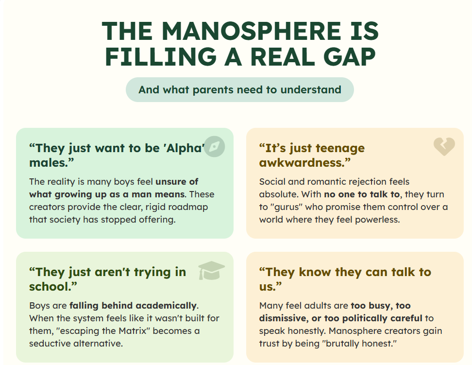 Most boys who are deep into this content have already heard the word “toxic” applied to everything they find interesting. The moment you lead with “this is toxic masculinity,” the conversation is over. He’s heard it. It doesn’t land. It actually pushes him further in, because it confirms what these creators told him: that adults will just dismiss anything aimed at men.