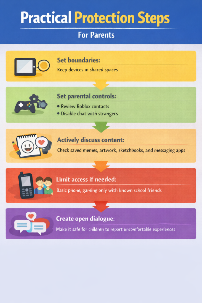 - Educate students: Age-appropriate lessons about manipulation tactics and online grooming