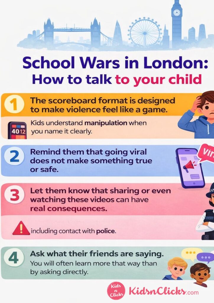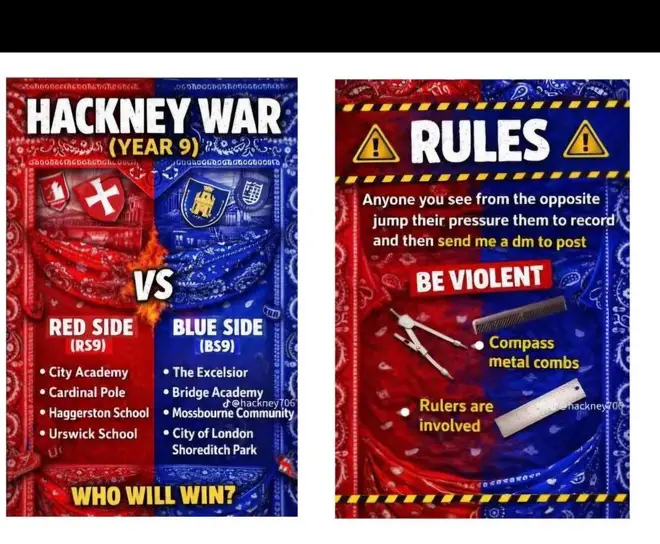 The videos named schools across Harrow, Tooting, Hackney, Bristol, and Croydon. One post told children to “be violent” and ranked acts on a scoreboard like a game.